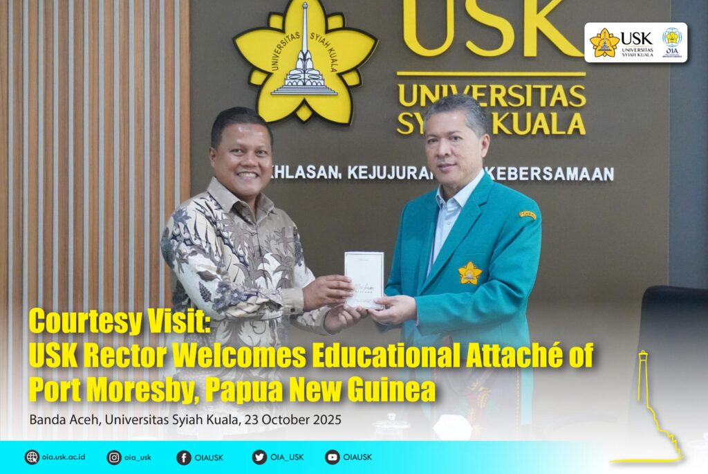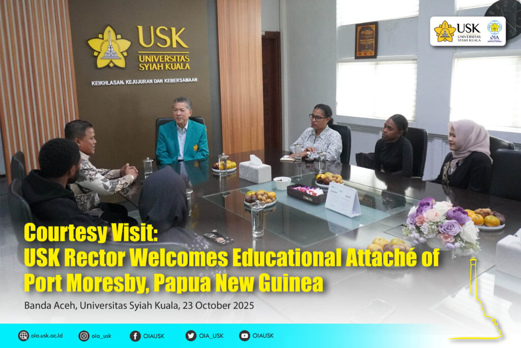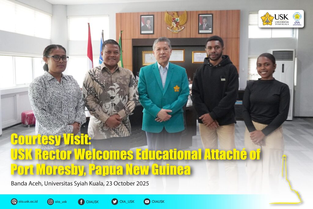 The Rector of Universitas Syiah Kuala (USK), Prof. Marwan, welcomed the visit of the Educational Attaché of Port Moresby, Papua New Guinea, Arief Kusdwiadnanto, on Wednesday, 23 October 2025, at the USK Mini Rector’s Meeting Room. The visit aimed to monitor the progress of international students from Papua New Guinea and the Solomon Islands currently pursuing their studies at USK.